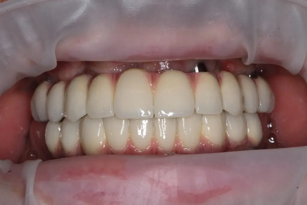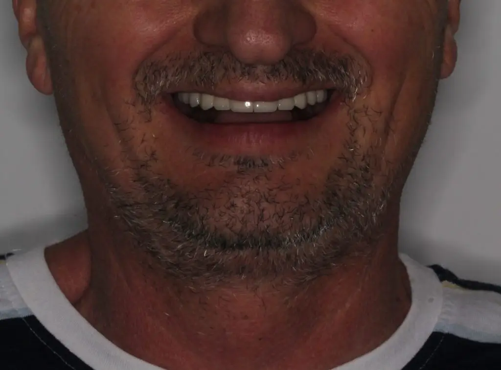 Dupa o perioada de 6 luni de osteointegrare, s-au realizat lucrarile definitive din ceramica stratificata pe zirconiu, atat la maxilar, cat si la mandibula. Rezultatul final a restabilit ocluzia, un zambet natural.