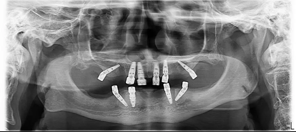 Am efectuat o reabilitare completa prin inserarea a 6 implanturi la maxilar si 4 implanturi la mandibula. In 24 de ore, a primit doua lucrari provizorii fixe, care a asigurat functionalitate si estetica imediata